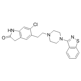 体内实验Ziprasidone (oral gavage; 20 mg/kg; once daily; 7 weeks) results in weight loss, low level physical activity, high resting energy expenditure and greater capacity for thermogenesis when subjected to cold. Animal Model:Eight-week-old female Sprague-Dawleyrats weighing 200 to 250 g Dosage:20 mg/kg Administration:Oral gavage; 20 mg/kg; once daily; 7 weeks Result:Gained significantly less weight (P = 0.031), had a lower level of physical activity (P = 0.016), showed a higher resting energy expenditure (P < 0.001), and displayed a greater capacity for thermogenesis when subjected to cold (P < 0.001).